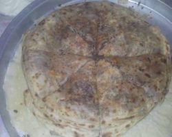 Malzemeler: 5-6 kişilik 1-1,5 kg undan hazırlanmış katı hamur,1 kase çökelik veya kıyma veya yağda pişirilmiş 3-4 yumurta,